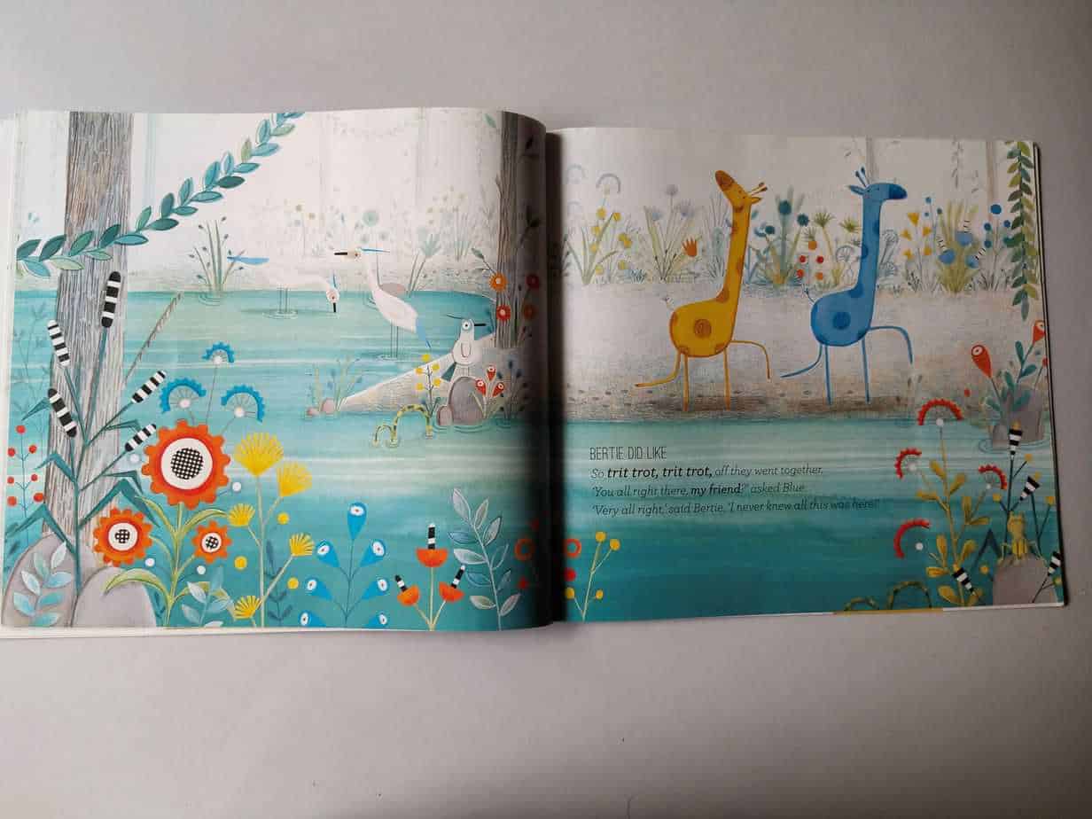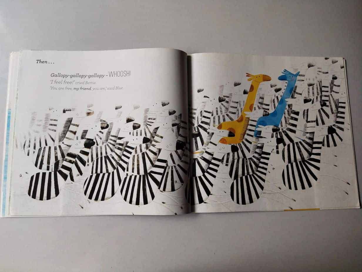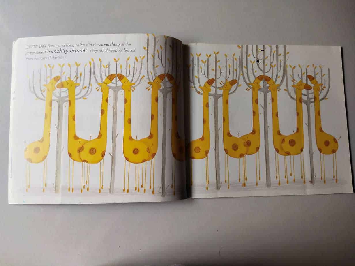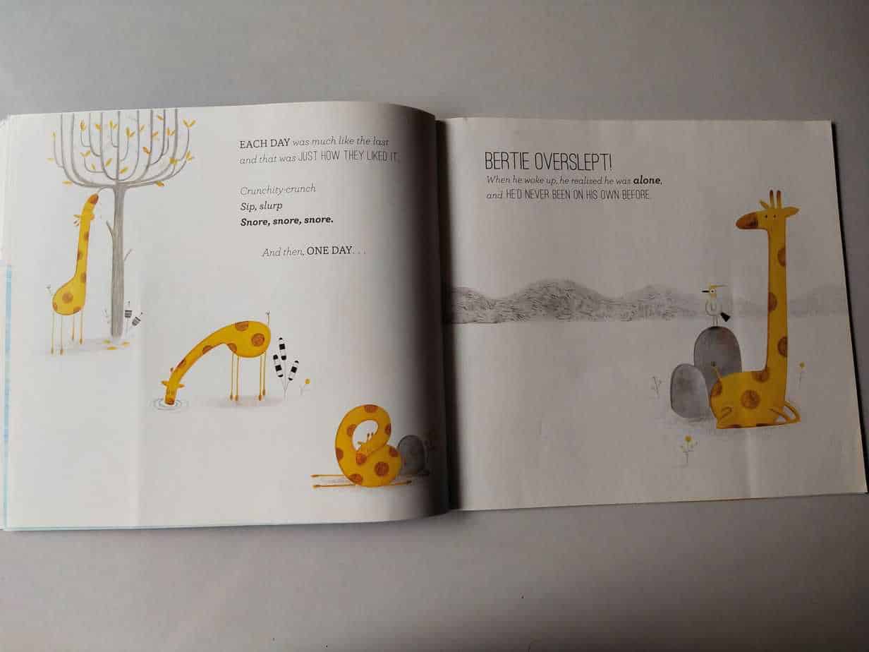 Bertie is a giraffe who loves to do things in a routine. He ate the same leaves, strolled the same way, and slept under the same tree. His routine was basically sipping, slurp, and snore until he overslept a day. He wakes up alone, and he doesn’t know which way to go. On the way, he meets a unique giraffe called Blue. Both the giraffes were scared to talk, but they got along with each other. They enjoyed each other’s company, have amazing adventures together, and they both became best friends. But Bertie still wants to go home, and that’s when his friendship with Blue was tested. Will Bertie take Blue with him, and will the yellow giraffes accept Blue?