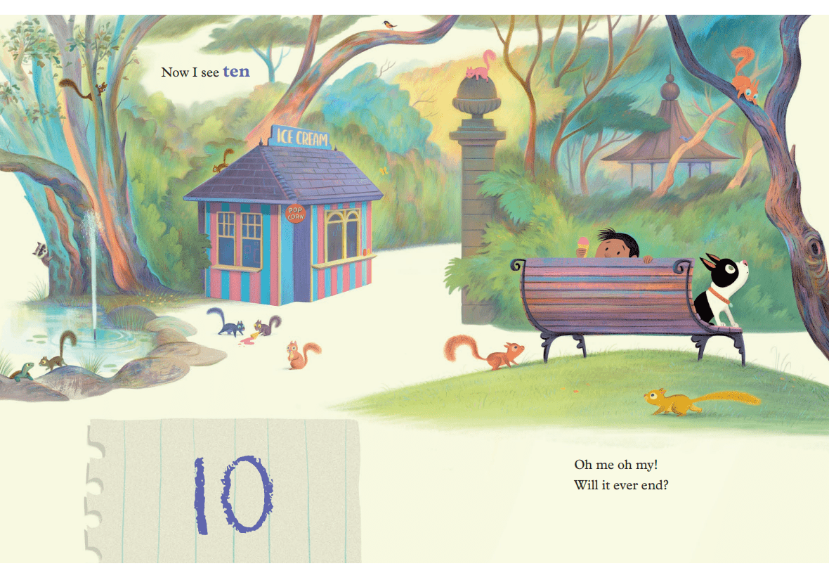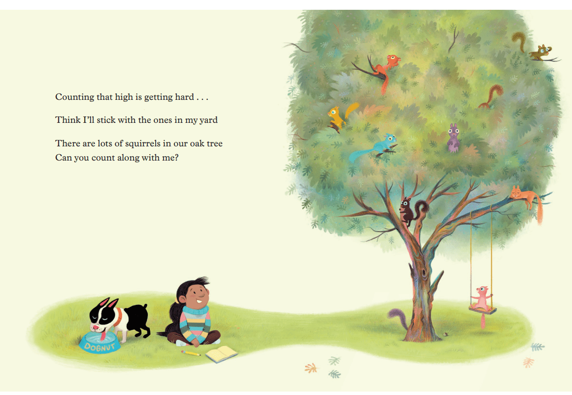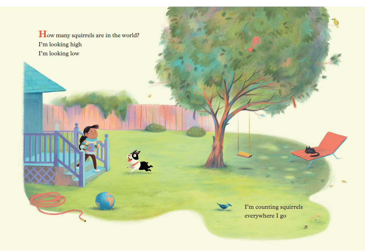 A curious little girl wanted to know how many squirrels there were in the whole wide world. But she and her dog decided to notice how many squirrels there were outside in the yard. Armed with a notebook, the girl begins to count the squirrels high and low and notices where they like to hang out, while her dog delights in chasing them. They venture to a local park, where they see even more. When the girl counts up to twenty, she questions how many squirrels there must be in the world, but is tired of counting them. Will she be able to keep track of this pesky creature?