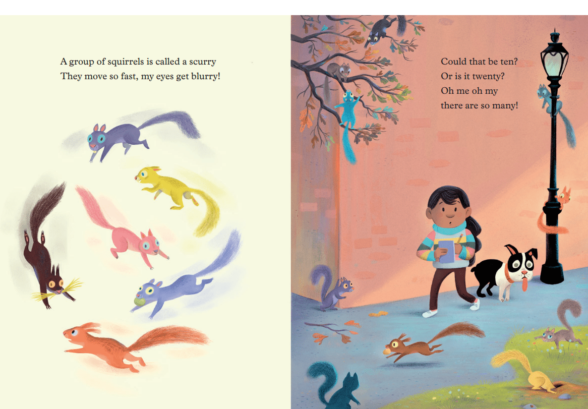 I love the bright artwork on each page and the illustrator has given different colours to the squirrels rather than sticking with the boring brown colour. If you can look closer at each illustration, you can find squirrels jumping from one branch to another, chasing one another, and collecting nuts.