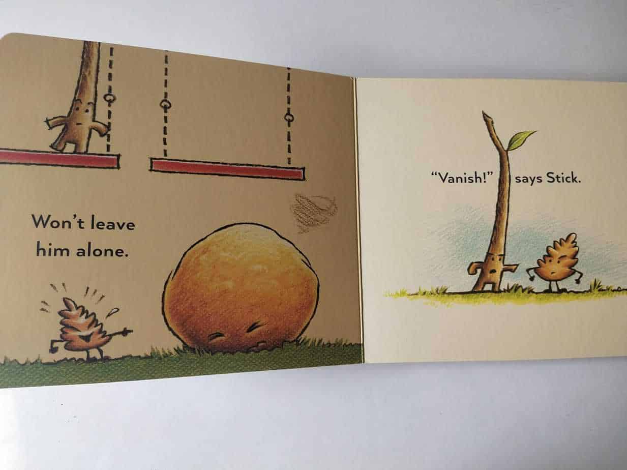 This is a story of two friends, a stick and a stone. Stick and stone found each other and they became best buddies during an encounter with a pinecone. Pinecone makes fun of Stone, but a single word from Stick makes Pinecone go away. he says, “Vanish!” Follow the stick and stone’s journey in this brightly illustrated picture book.