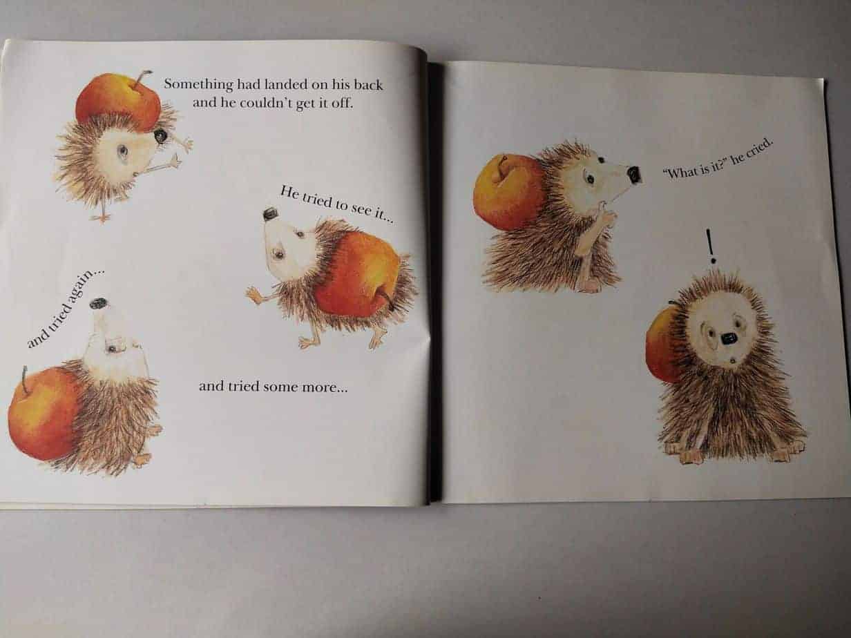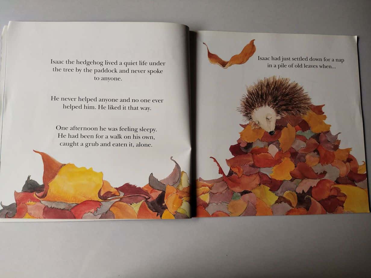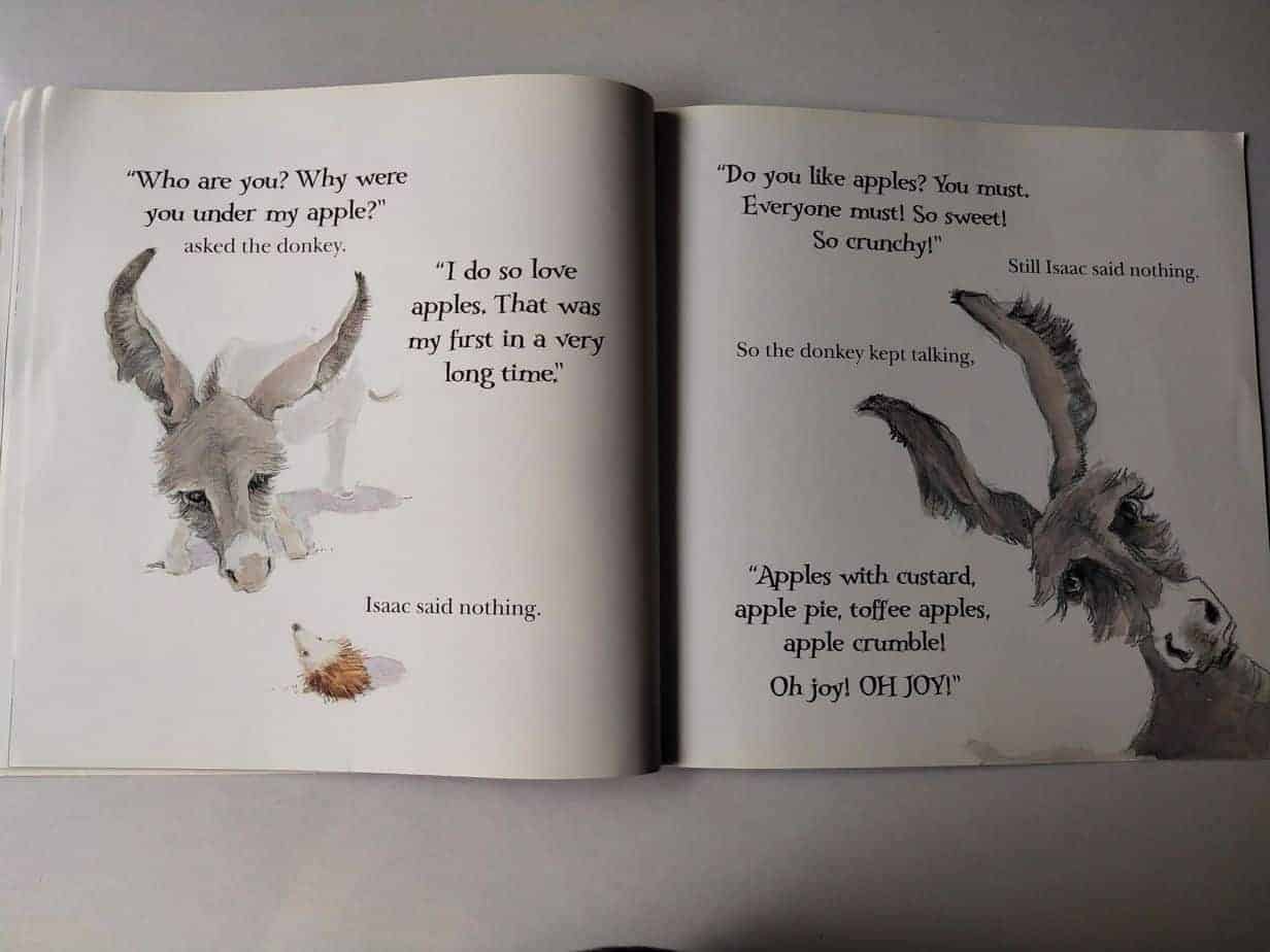 Isaac is a hedgehog who spends all his time alone and likes it that way. One day, an apple falls from a tree and is stuck on his prickly back. No matter how hard Isaac tries, he cannot shake it off. In his distress and tears, he does not even hear a nearby donkey who crunches the apple right off his spikes. Relieved to be free of his burden, Isaac returns to his solitary life. But when another apple drops by his side, he decides to deliver it to the apple-loving donkey, becoming one very helpful hedgehog.