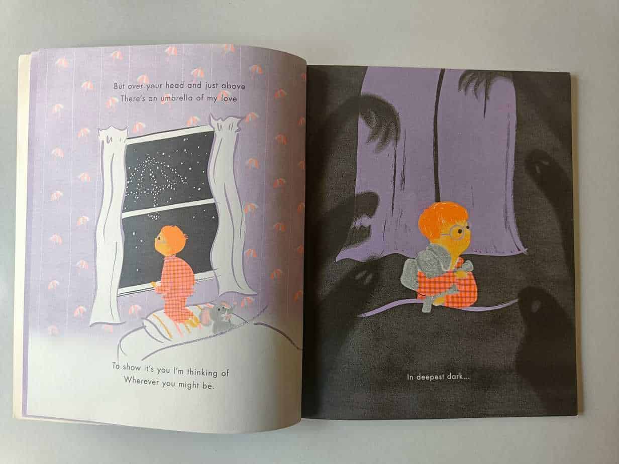 This story walks us through four different kids through difficult times, as the narrator describes the “love umbrella” which is above each of them. The four children Joe, Brian, Grace, and Izzy, are introduced opposite the title page, asking readers to count the umbrellas they find. They face scary shadows, friends that don’t share, shyness, feeling lost, sadness, moving houses, a lost tooth, and a parent that’s rushing them. No matter what happens, no worries can last under a love umbrella; it protects them.