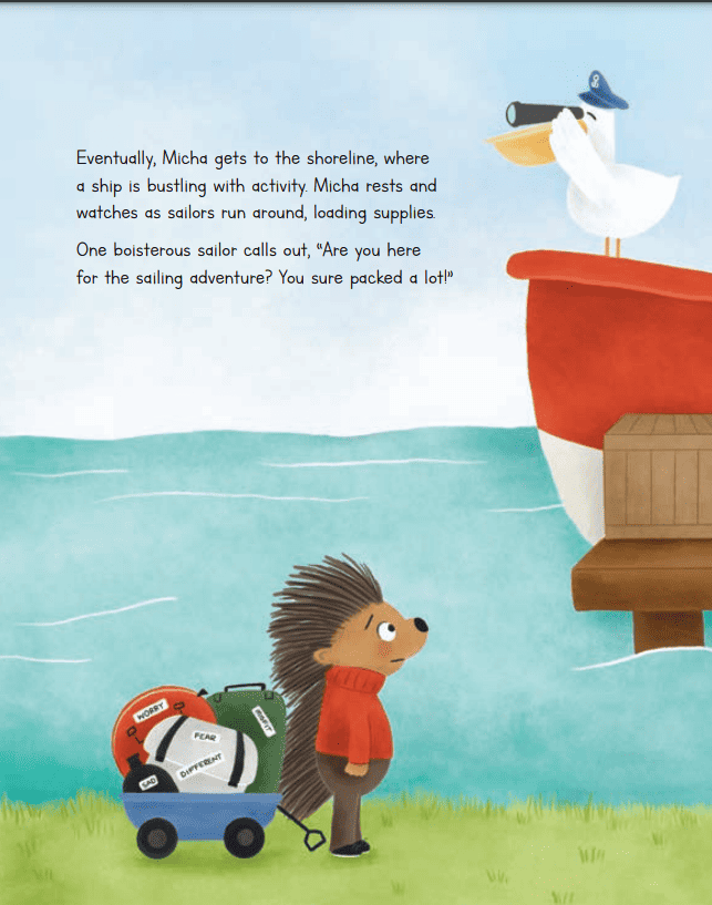 The story Baggage is about a child named Micha who always carries a wagon filled with bags labelled with emotions like fear or sadness. Despite being surrounded by kind people who invite Micha to play, sing, and have adventures, Micha refuses to participate. She regrets missing out on a kickball game, karaoke, and a boat ride, yet she holds to the bag tightly. This is because Micha is afraid of losing sight of the bags and missing the opportunity to address the emotions they contain. Micha’s fear of losing out on the chance to confront these emotions causes them to miss out on the fun and joy of life. But one day something unexpected happens and will she let go of her bags or will she run behind them?