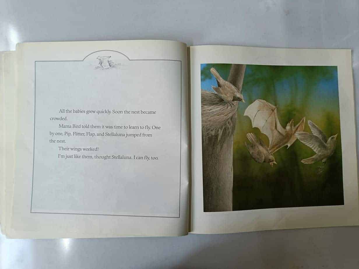 When the birds grow, they learn to fly. When Stellaluna and the birds are out playing, it gets dark, and the birds go home without her because they will not be able to see in the dark. Stellaluna keeps flying, but when her wings hurt, she stops to rest. When she does, she hangs by her thumbs. Soon other bats come, and one asks Stellaluna why she is hanging by her thumbs. As she tells the other bats her story, Mother Bat reunites with her and Stellaluna finally understands why she is so different.