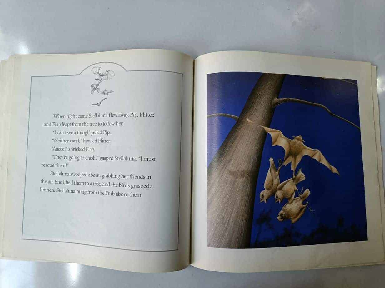 Excited about learning how to be a bat, Stellaluna returns to Pip, Flitter, and Flap to share her new experiences. They agree to join Stellaluna and the bats at night but find they are unsuited to flying at night and nearly crash. Stellaluna rescues them, and the four of them decide that while they may be very different, they are still friends and family.