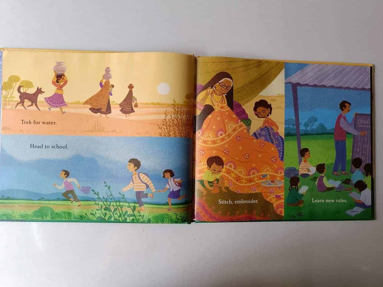 This book compares both families based on living spaces, landscape, clothes, jewellery, climatic conditions, lifestyle, food, and other details. Each page is illustrated in a way where we can see similarities between the boy’s family and the girl’s family, even when they are in different climatic conditions.