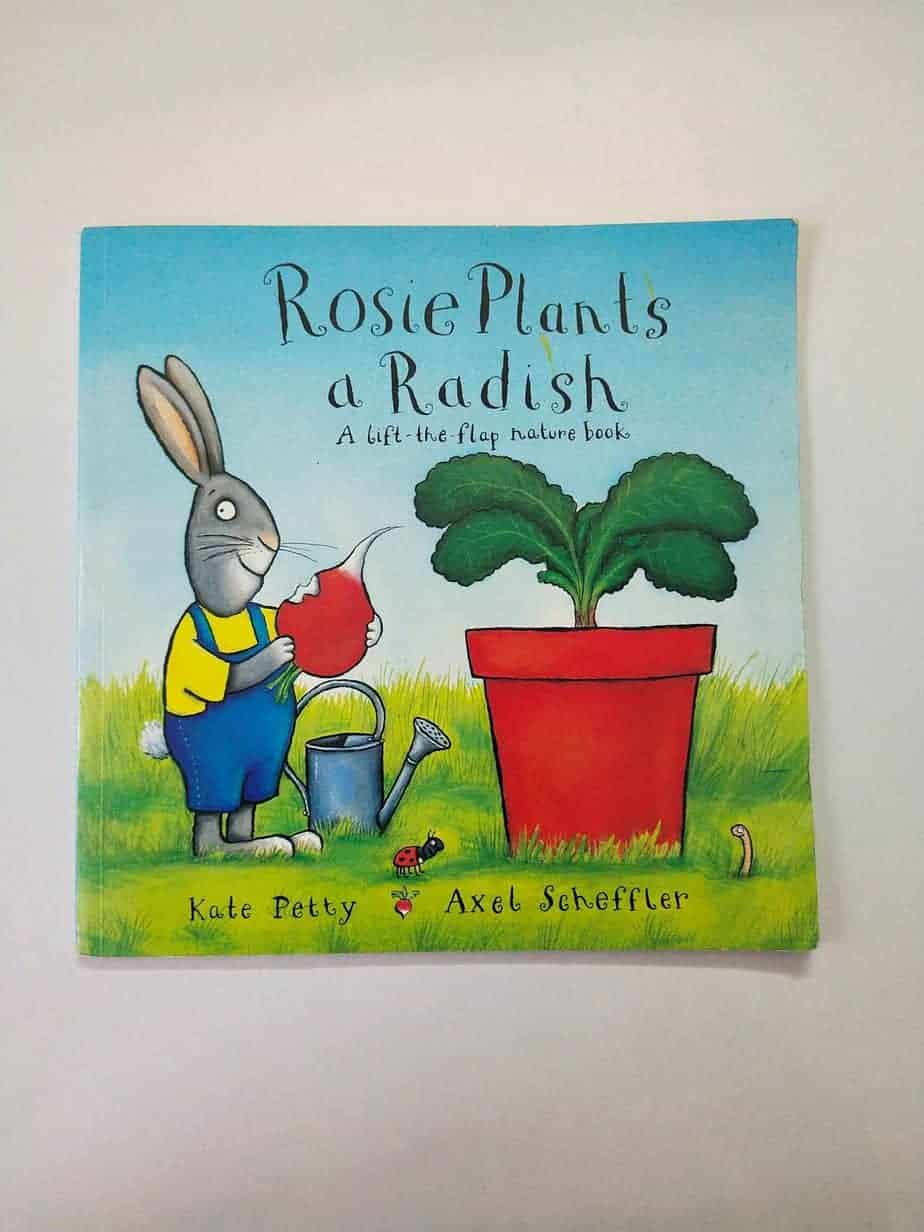 Rosie loves radishes and plants the radish seeds, watches the plants grow and finally pulls the radishes up. A book that says happening to the plant under the ground. This was a perfect book that helped Nathan picture germination.